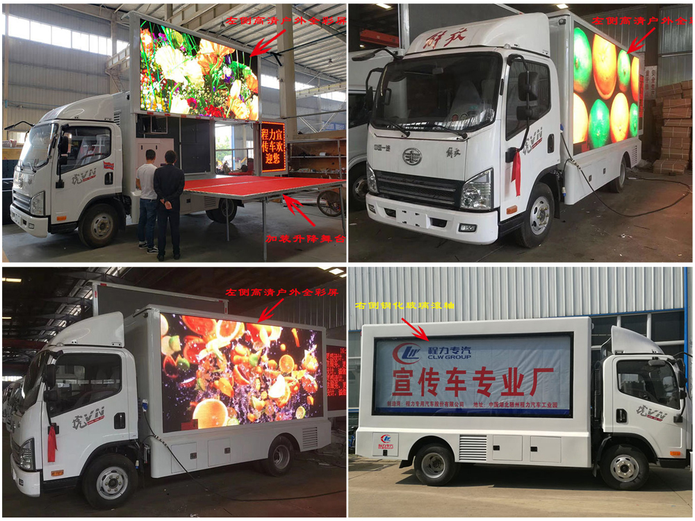 廣告車選裝配置:客戶可根據(jù)需求選裝屏幕清晰度(P10彩屏、P8彩屏、P6彩屏、P5彩屏、P4彩屏)、單面彩屏、雙面彩屏、雙面