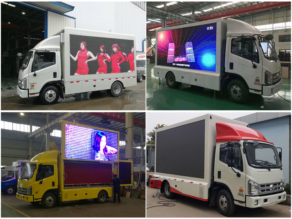 廣告車(chē)選裝配置:客戶可根據(jù)需求選裝屏幕清晰度(P10彩屏、P8彩屏、P6彩屏、P5彩屏、P4彩屏)、單面彩屏、雙面彩屏、雙面